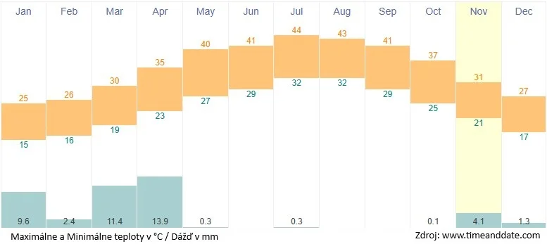 Mesto sa nachádza v nadmorskej výške 7 m a má horúcu púštnu klímu. Priemerná ročná teplota je 28°C a priemerný ročný počet zrážok je iba 57 mm. Najlepšie mesiace sú december a január, s teplotami vzduchu max 25°C / min 21°C a teplotou mora 23°C.