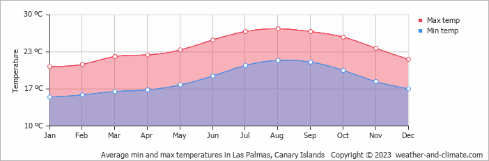 Priemerné minimálne a maximálne teploty v Las Palmas de Gran Canaria.